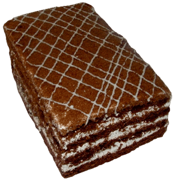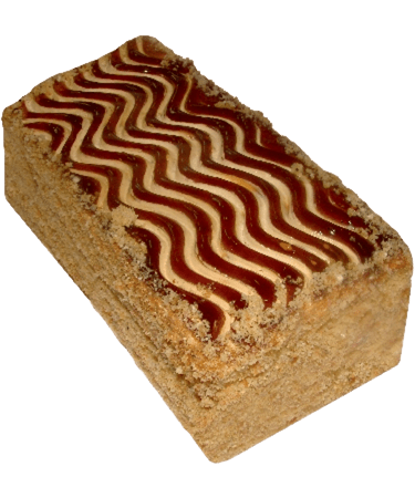 Нежный бисквит прямоугольной формы со сливочно-молочной прослойкой. Верх — отделка карамельным гелем, нанесённым по контору волнообразным рисунком