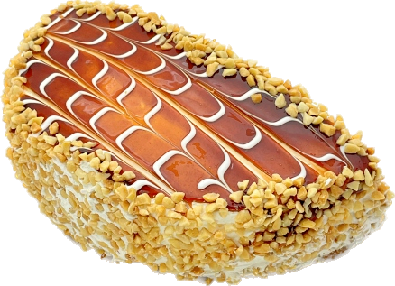 Нежный бисквит со сливочной начинкой в форме полукруга, декорирован гелем и дробленным арахисом
