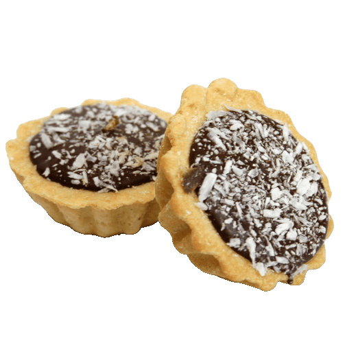 Из песочного теста в форме тарталетки с начинкой пломбир, поверх пломбира в виде капли клубничный конфитюр и залито шоколадным ганашем, кокосовой стружкой